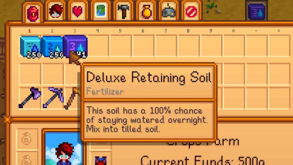 Before we even touch the crops, let’s talk about crop enhancers. I am talking about fertilizers, retaining soil and speed grow. You need to master these to master farming in this game.